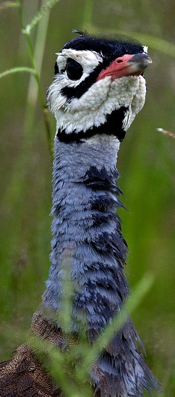 White-bellied bustards are common in tall or burned grassland. Note both sexes have the characteristic blue-grey neck, confined in the female to the hindneck. The fliight photo is courtesy of Marie-France Gremoullet; the 2nd row photo (Serengeti NP) is courtesy of Karine Van der Vurst; and the left 3rd row (Mkomazi NP) is courtesy of Kim Axmann. All of the other photographs were taken in Tarangire and the Serengeti; the right lower female is courtesy of Henrik Kisbye. Click the left lower photo to see 14 enlargements that include immatures and a displaying male.