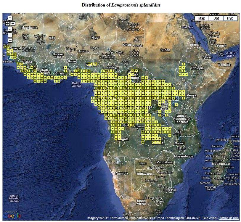 The largest of the glossy starlings, the splendid starling is found in northwest Tanzania. The upper photo (Ibwera-Bukoba) is courtesy of Paul Edwards; the 2nd row (Kyaka), courtesy of Frank Priscus Shirima. The right lower bird was also seen in Bukoba , courtesy of Per Holmen. The other photos were taken in Minziro Forest and Bukoba. |