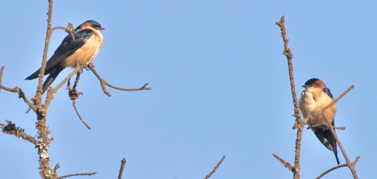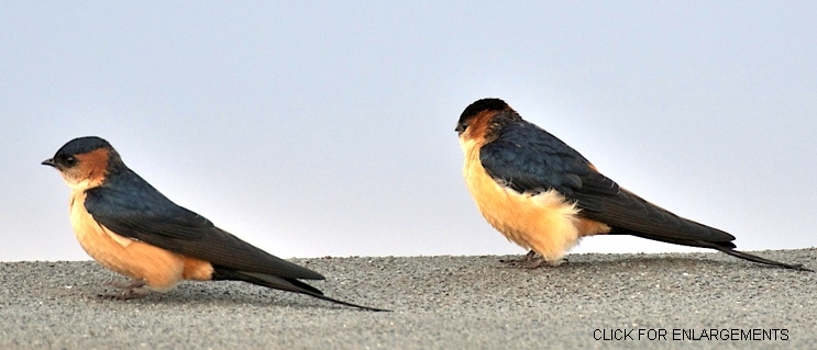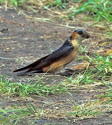 The African red-rumped swallow is the only red-rumped swallow with rufous ear coverts. The upper photo was taken in Ngorongoro Crater, courtesy Linda Bushman. The left 2nd row bird was seen in the Serengeti, courtesy of Rick Carlson; right 2nd row, Grumeti Reserve, courtesy Paul Oliver; both 3rd row photos, Tarangire; left 4th row, Mkuzi and the right 4th row, Soitorgoss. The bottom photo, location unrecorded, is courtesy of Doug McLennan; click it to see 10 enlargements.