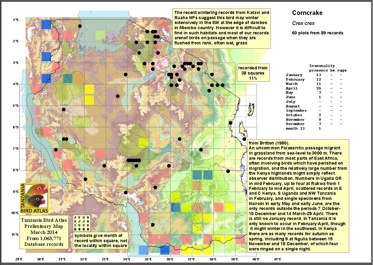 The corn crake is a palearctic migrant from September to April. The top photo was taken in Ruaha NP, courtesy of Sue Stolberger; the unlucky corncrake in the 2nd row was seen in Mkomazi NP, courtesy of Kim Axmann; the right 3rd row (Mkomazi) is also courtesy of Kim Axmann; the left 3rd row, Arusha NP, courtesy of Alex Rees; the right 4th row, Katavi NP, courtesy of Paul Oliver; and the bottom photos, TPC-Moshi, courtesy of Phil Stouffer. |