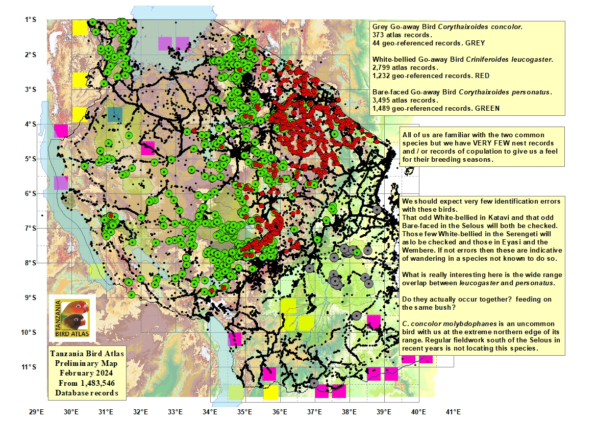 The grey go-away-bird is seen in southern Tanzania. The upper bird was photographed in Etosha NP-Namibia, courtesy of Mike Graham. The left 3rd row bird in flight was seen in Hwange NP-Zimbabwe. The other photos were taken in the Okavango delta-Botswana. |
