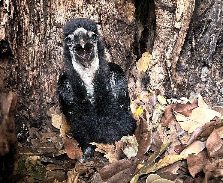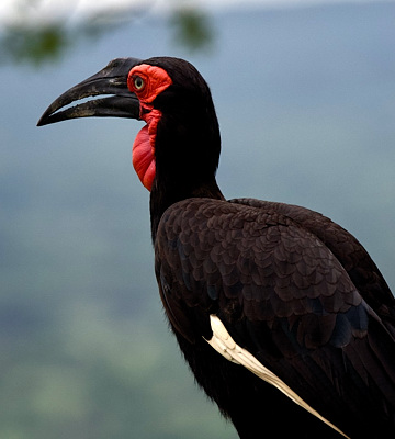 The lower four photos show a southern ground-hornbill feeding insects to chicks in a nest in the hollow top of a broken palm tree trunk. The enlargements include feeding of young in a cavity nest. Most of the other photos show birds in bushed or wooded grassland which is their preferred habitat. The adult male has red facial skin and a small "notch" on the top of the bill near the base; the female has a blue throat patch, sometimes easily seen (see slideshow photos #32 & 33), sometimes speckled or inconspicuous; immatures have yellow facial skin. The chick (Marangu) is courtesy of Amos Pampy Hardecker. Note slideshow photos 2-7 which show a "dancing" or bonding behaviour. These photos were taken in Tarangire NP, Lake Manyara NP, Okavango delta and the Serengeti. Click the photo above to see the enlargements. |