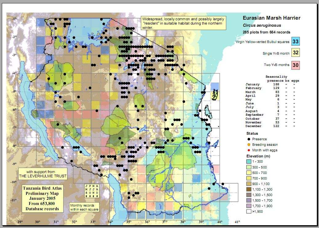 The upper two photos were taken at Silale swamp. The 3rd row male was at Lake Manyara, courtesy of Karine Van der Vurst and the 4th row female was at Tarangire NP, courtesy of Hanna Nyman. The other photos were taken at TPC-Moshi, Ngorongoro Crater, Ndutu, the Momella Lakes-Arusha-NP and Silale swamp.