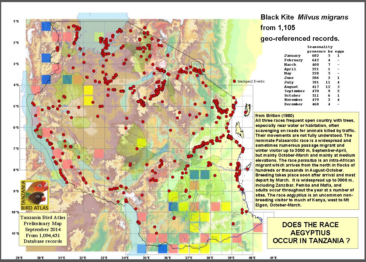 These photos were taken in Kisongo, Lengijave, Ngorongoro Crater, and Queen Elisabeth NP-Uganda. The upper photo is courtesy of Per Holmen; the 2nd row, courtesy of Chuck Derby, left 3rd and 5th row photos, courtesy of Joseph Morlan; right 3rd row, Mladen Mates; left 4th row, courtesy of Karine van der Vurst; and the right 4th row, courtesy of Frank Priscus Shirima. Click the Identification link for a discussion of separating black and yellow-billed kites. |