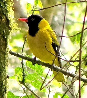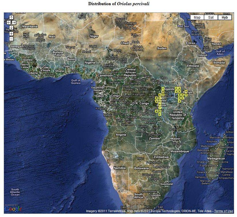 The black-tailed oriole, also called montane oriole or mountain oriole, is an east African endemic, uncommon in Tanzania in the higher elevations of the northwest. Similar to the black-headed oriole, the upper side of the central tail feathers is black instead of olive green. The upper two and left 3rd row birds were seen in the Castle Forest-Kenya, courtesy of Per Holmen; the right 3rd row, in the Nyungwe Forest-Rwanda, courtesy of Jason Anderson. |