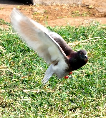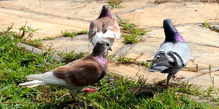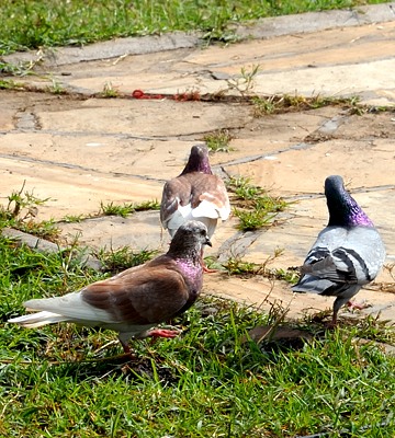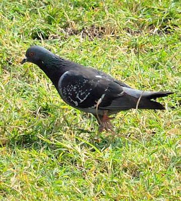 The rock pigeon is an introduced, variable, mainly urban bird that may show black, slate, purple, brown or white colors. These photos were taken in Olasiti. |