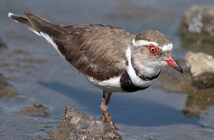 The three-banded plover which is common on freshwater wetlands has two black breast bands separated by a white band. The upper photo (Mapungubwe NP-SA) is courtesy of Karine Van der Vurst. The eggs were photographed by the bridge near Kuro airstrip in Tarangire. The other photos were taken at Lake Manyara, Olasiti, Tarangire, Lake Eyasi, Arusha NP and Ndutu. Click the left lower photo to see 16 enlargements including chicks.