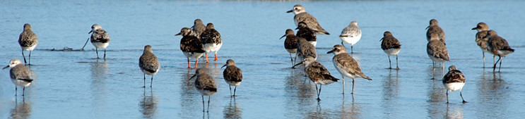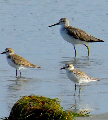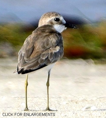 The greater sandplover is a palearctic migrant present in East Africa from August to May. The flight photos (Emayani) are courtesy of Paul Oliver and the 5th row photos (Pangani), are courtesy of Valéry Schollaert. The photo of netted birds shows a greater sandplover on the left and a lesser sandplover. Note the larger, longer bill in the greater sandplover. Click the comparison link for further discussion of lesser and greater sandplovers. The upper photo includes several greater sand plovers and was taken at Pembe Abwe The right lower photo with a greenshank was taken at Pembe Abwe. The left lower photo (Pangani), is courtesy of Per Holmen; click it to see 9 enlargements including with greater and lesser sandplovers. The other photos were taken in Olasiti. |