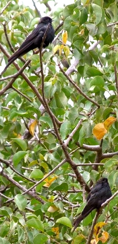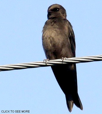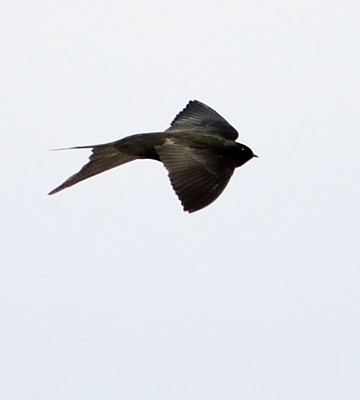 The black sawwing is a large (15 cm) swallow with gray-brown underwing coverts. The left upper image was taken at Maji Moto, courtesy of Colin Beale; the right upper, at Arusha NP, courtesy of Paul Oliver. The center photos were taken in Magamba FR (left) and Arusha NP; the right lower photo, at Kibale NP-Uganda, courtesy of Karine Van der Vurst; and the left lower, West Kilimanjaro. The slideshow includes immatures and adults; the adults have a deeply forked tail which immatures lack; click the right lower photo to see 8 enlargements. |