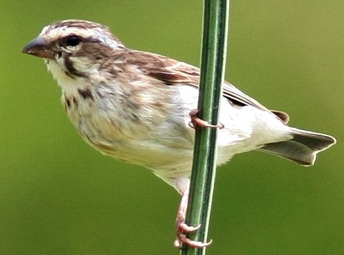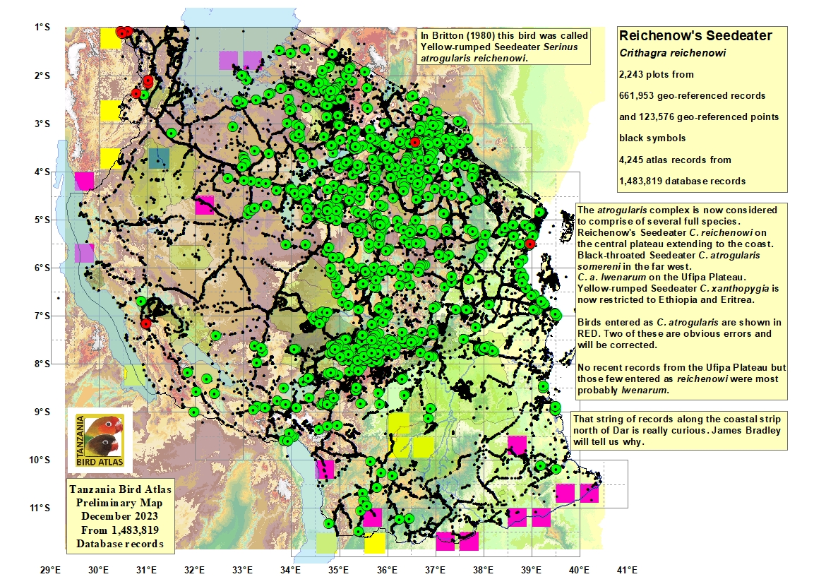 Reichenow's seedeater is a northeast African endemic. The upper bird was seen at Lake Eyasi and the 4th row pair, at Tarangire, both courtesy of Karine Van der Vurst; the 2nd row bird, at Nyang'oro, courtesy of Michael Poulsen; 3rd row, at Lake Manyara, courtesy of Doug McLennan; and the lower bird, at Pangani. Click the photo above to see 9 enlargements. |