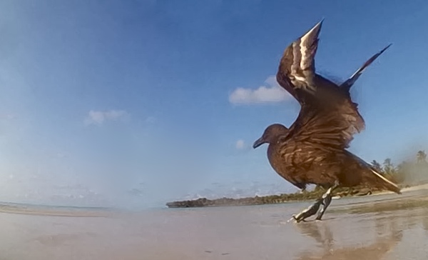 This injured brown or subantarctic skua is a rare visitor to the East African coast. These photos were taken on Fanjove Island, courtesy of Pietro Ciotti. The bird weighed 1.2 kg initially, 1.6 on release; wing length, 40 cm; tail, 17 cm; and the beak, 5cm.