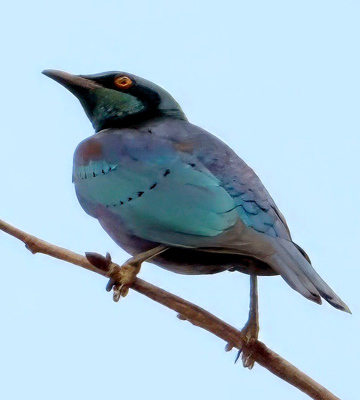 The lesser blue-eared starling, formerly miombo, is similar to the greater blue-eared starling, but in good light the belly and flanks are magenta, not well seen in the photos above (upper, Mikumi; middle, Msumbugwe forest). The juvenile in the lower photo (Msumbugwe forest) shows the distinctive mottled, rust-coloured underparts. The left 2nd row adult (Mikumi) is courtesy of Per Holmen. |