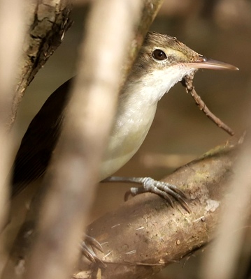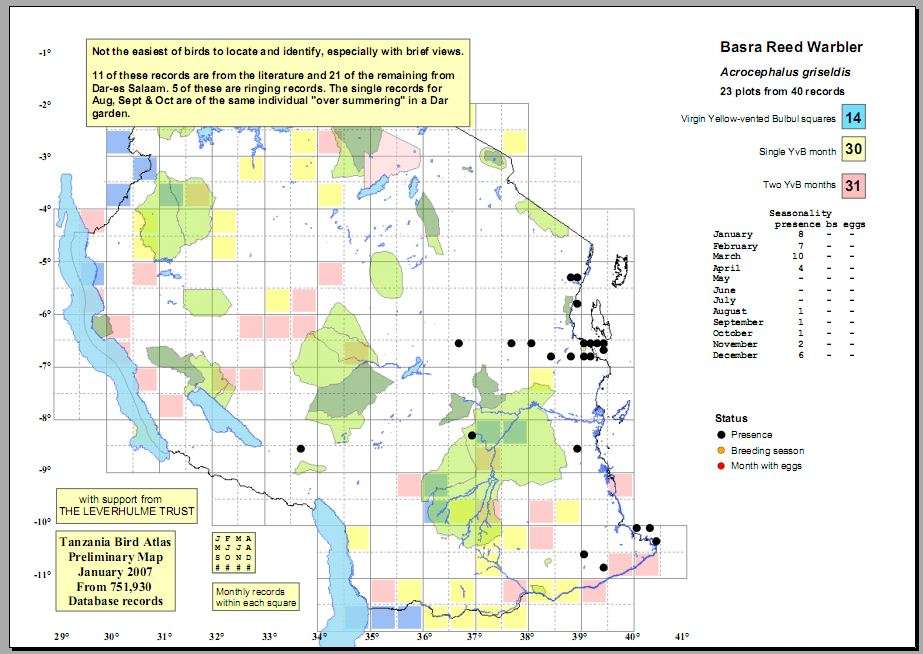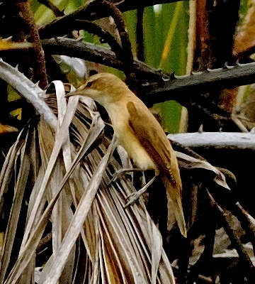 The Basra reed-warbler is a large palearctic migrant (15 cm) with a dark tail, slim body and a long pointed bill, infrequently seen in reed beds and rank vegetation along the coast and sometimes inland. The right upper photo was taken at the Pangani River. The other photos were taken at Mbuyuni Farm near Morogoro, courtesy of Kim Axmann.