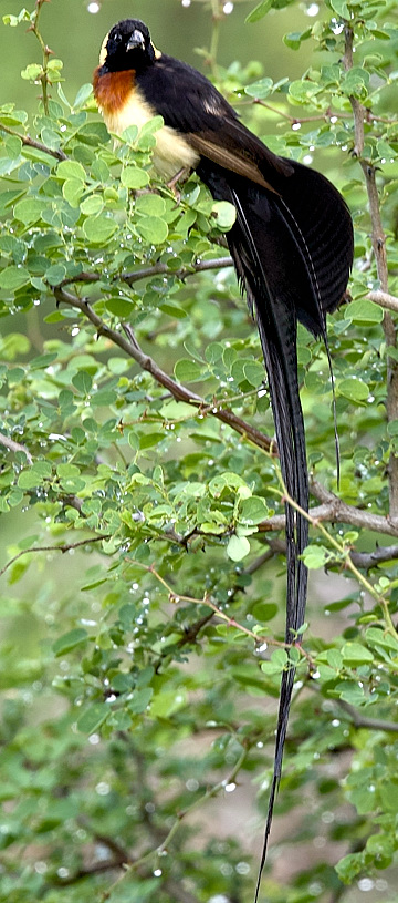 The eastern paradise whydah parasitizes the green-winged pytilia. The 3rd row photo (Mkomazi) is courtesy of Per Holmen; the right 4th and the 5th row photos (Mkomazi) are courtesy of Kim Axmann; the right 6th row photo (Ruaha), is courtesy of Karine Van der Vurst. The left lower photo (Serengeti) is courtesy of Isaac Kilusu. The other photos were taken at Msumbugwe, Makuyuni, Tarangire, Makame Shambarai swamp, Lake Manyara and Orkesumet. Click the photo above to see 14 enlargements. |