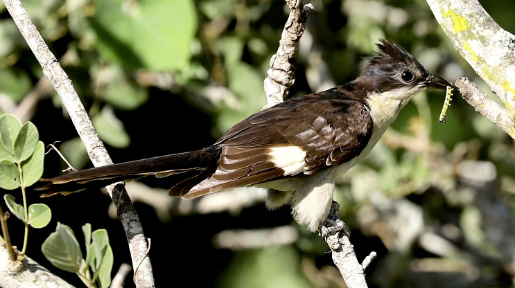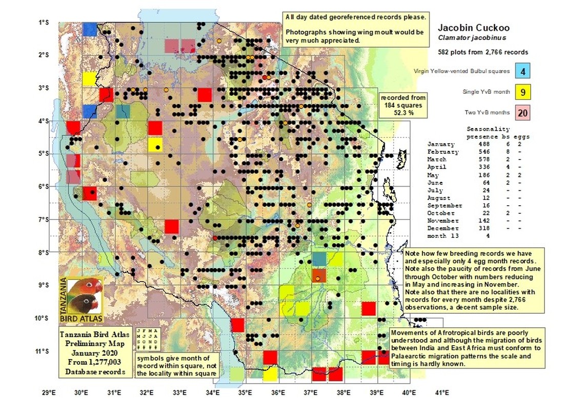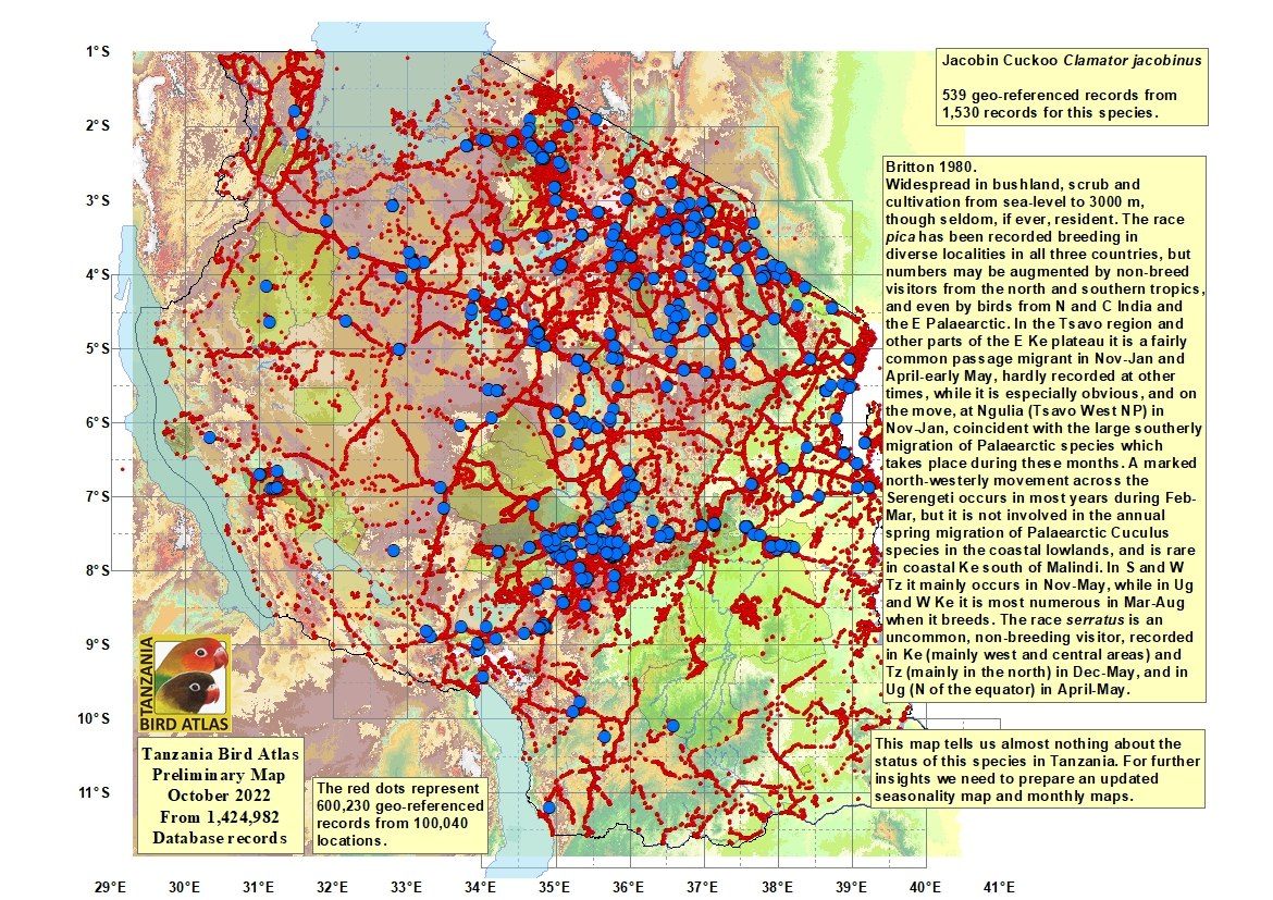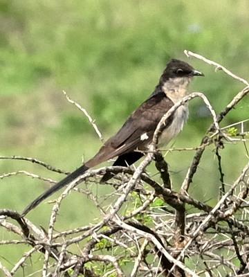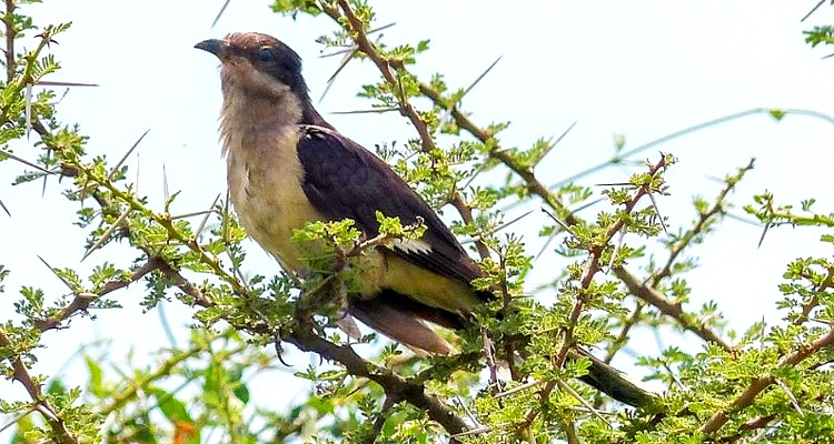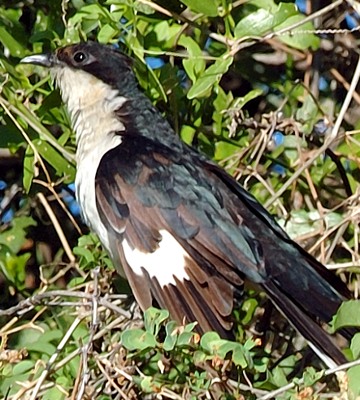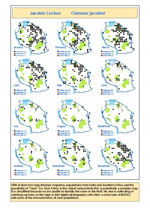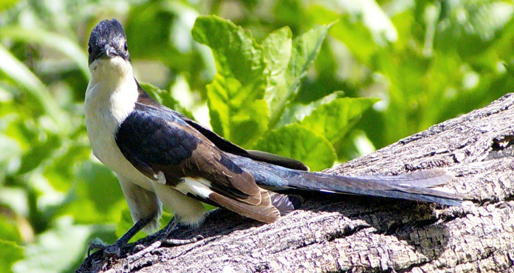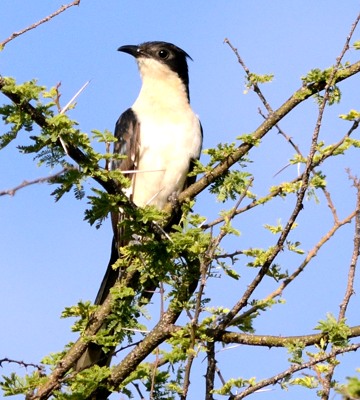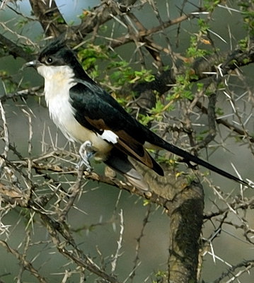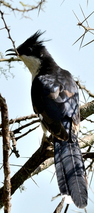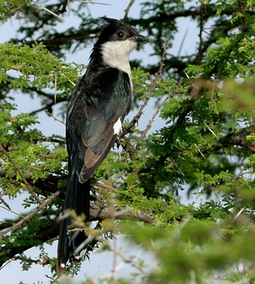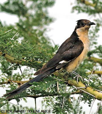 The pied cuckoo, formerly called Jacobin or black-and-white cuckoo, has a prominent crest and long tapered tail. The upper immature was seen in Mkomazi NP, courtesy of Kim Axmann; the 2nd row adult was seen in Ruaha, courtesy of Stuart Webb. The 3rd and left 4th row juveniles were seen in Ndutu, courtesy of Siegfried Woldhek) and Engikaret; note the brown back color and the light streaking and buff color on the neck and breast. The other photos were taken in Arusha NP, Serengeti, Ngutukoiti, Asogati Plain, Engikaret and Shambarai. Click the left lower photo to see 9 enlargements. |