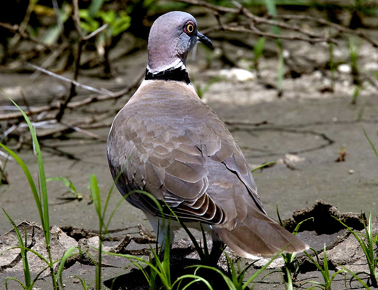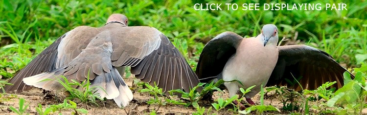 The upper panorama photo of a mourning collared-dove pair displaying was taken in Tarangire; click it to see a slideshow of another displaying pair. The 2nd and 6th row photos were also taken in Tarangire. The third row photo was in Komolo. The photo with ring-necked doves was taken at Ndutu, courtesy of Siegfried Woldhek. The right lower displaying dove (Lake Natron) is courtesy of Paul Oliver. The rest of the photos were taken at Nanja Dam. Click the left lower photo to see 16 enlargements including a nest.