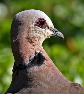 The red-eyed dove has a dark red iris; the eye is surrounded by a small patch of maroon skin. The left upper photo (Sakina, 8-15), is courtesy of Paul Oliver; the left 2nd row (Lake Bunyonnyi, 2-10) is courtesy of Karine Van der Vurst; The right upper photo was taken in Olasiti (11-16). The other photos were taken in Tarangire and Olasiti. Click the photo above for several enlargements including chicks in a nest and an immature. |