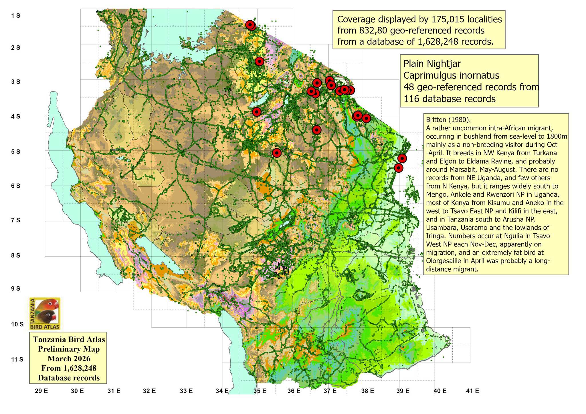 The upper plain nightjar was seen in Mkomazi NP, courtesy of Per Holman; the 2nd row bird in Ngaramtoni, courtesy of Hanna Nyman. The 3rd row bird was seen in Filfil, Eritrea, courtesy of Jason Anderson. The 4th row photo was taken at Lake Baringo-Kenya, courtesy of Karine Van der Vurst. The lower photo was taken at Magongo Hill near Arusha by Geoff Harries. |