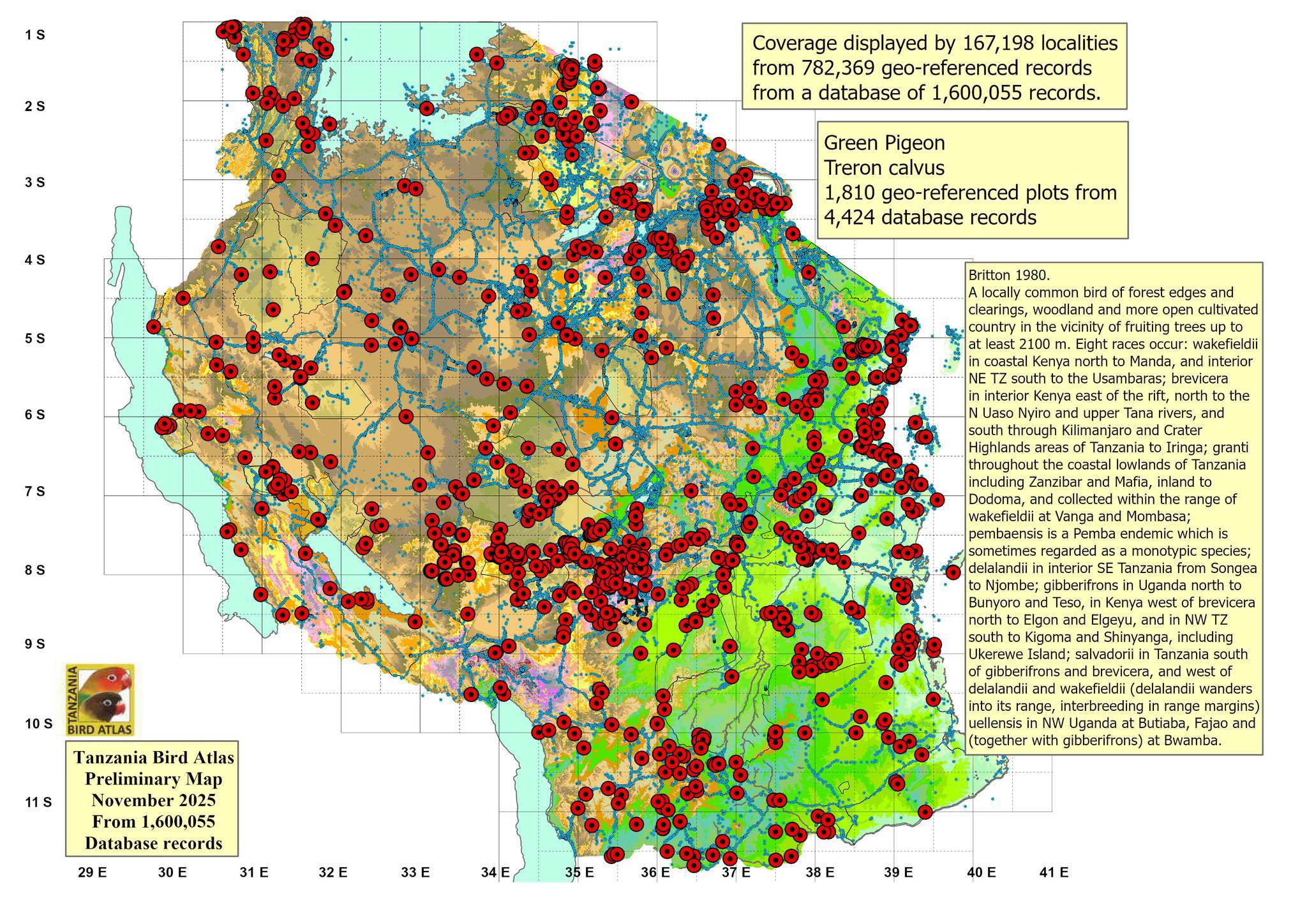 The African green pigeons in flight and on roost were photographed in the Udzungwa Mountains, courtesy of Dr. Louis A. Hansen. The 2nd row photos were taken in the Minziro Forest. The 3rd row photos were taken in Tarangire; the right 4th row, Lake Mburo NP-Uganda, courtesy of Isaac Kilusu and the 5h row photos, also Tarangire, courtesy of Mike Peterson. The lower photo was taken at Magongo Hill, courtesy of Anabel Harries; click it to see 10 enlargements. |