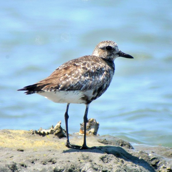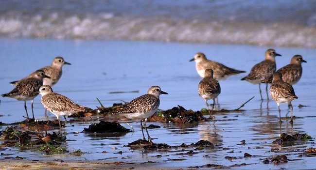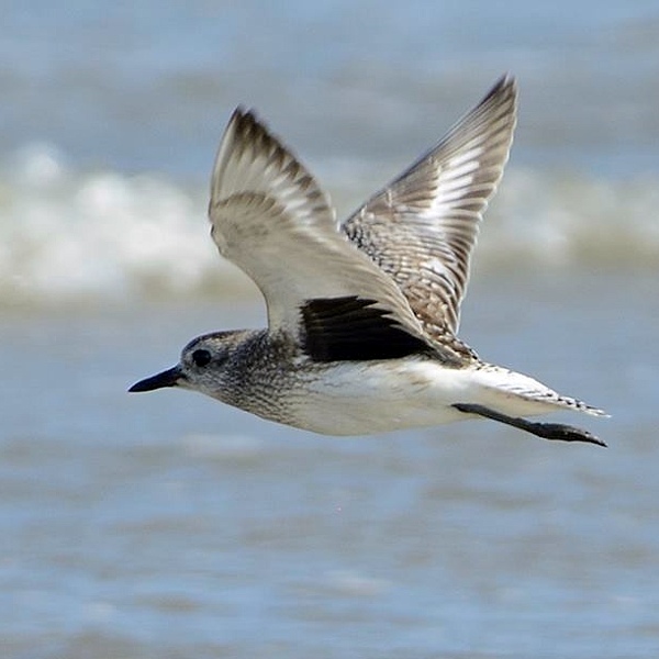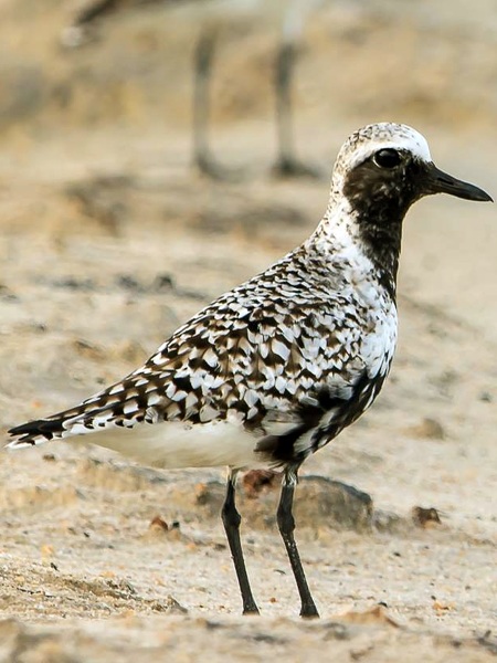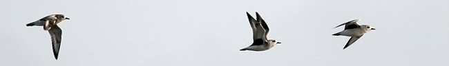 The grey plover is also called the black-bellied plover because in breeding plumage the underparts are black. The left upper photo showing transition to breeding plumage (Jangwani Salt Pans) is courtesy of Riaan Marais; right upper & 2nd row (Pangani) courtesy Valéry Schollaert; the single flight photo, Saadani, courtesy Per Holmen; and the trio in flight, courtesy Dr. Louis A. Hansen. |