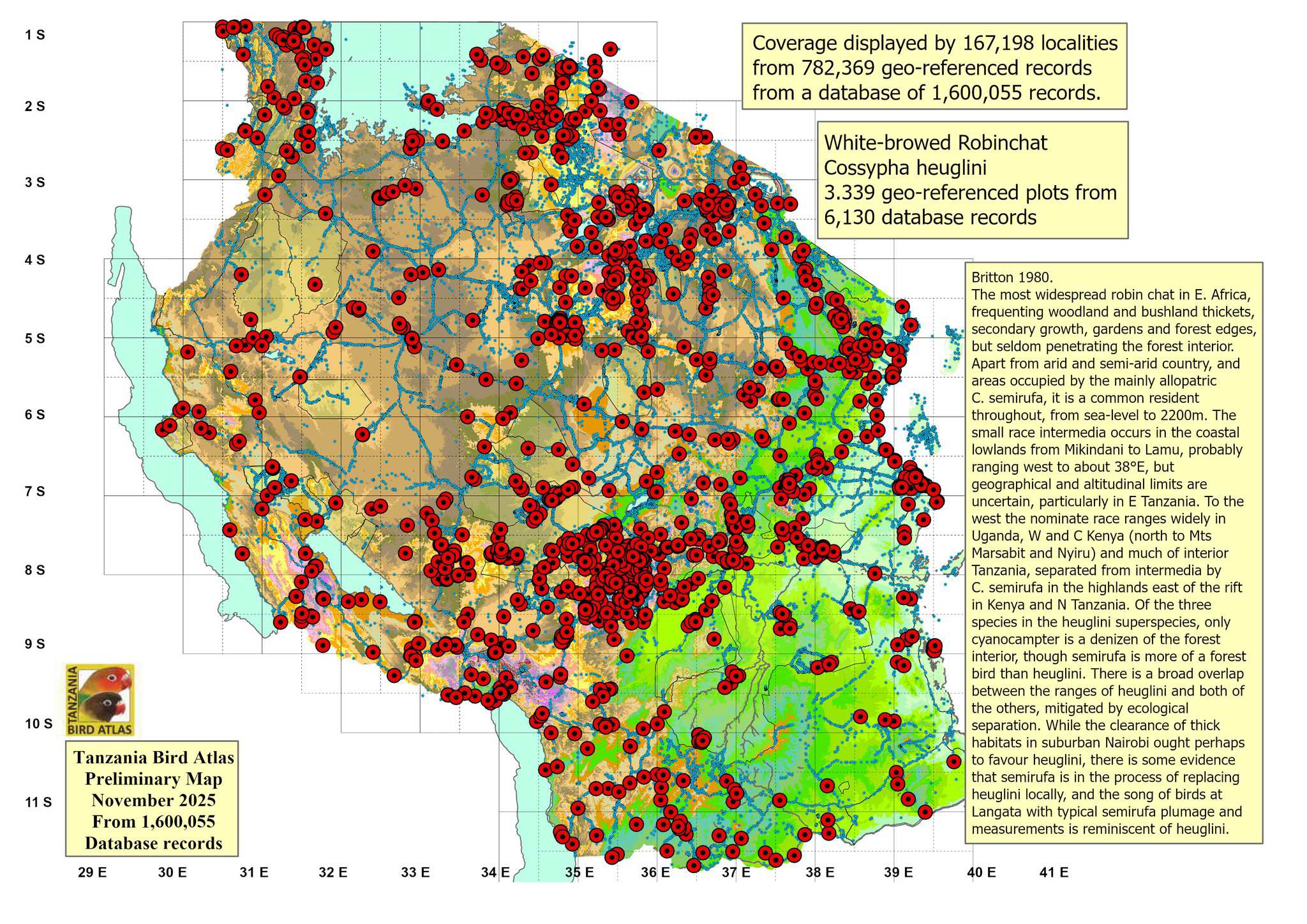 The left 4th row photo of a white-browed robin-chat was taken at Klein's Camp (11-08), courtesy of Steve Brynes. The chicks in nest were in Dar es Salaam, courtesy of Anne Outwater and the recent fledge was in Mwanza, courtesy of Graham Long. The right lower photo is courtesy of Gerrit Wyma; note the olive-brown central tail feathers which separate this species from Rueppell's robin-chat with black central tail feathers. The other adults were seen in the Migunga Forest, Marangu and Speke's Bay. The enlargements include eggs, chicks and a juvenile. |