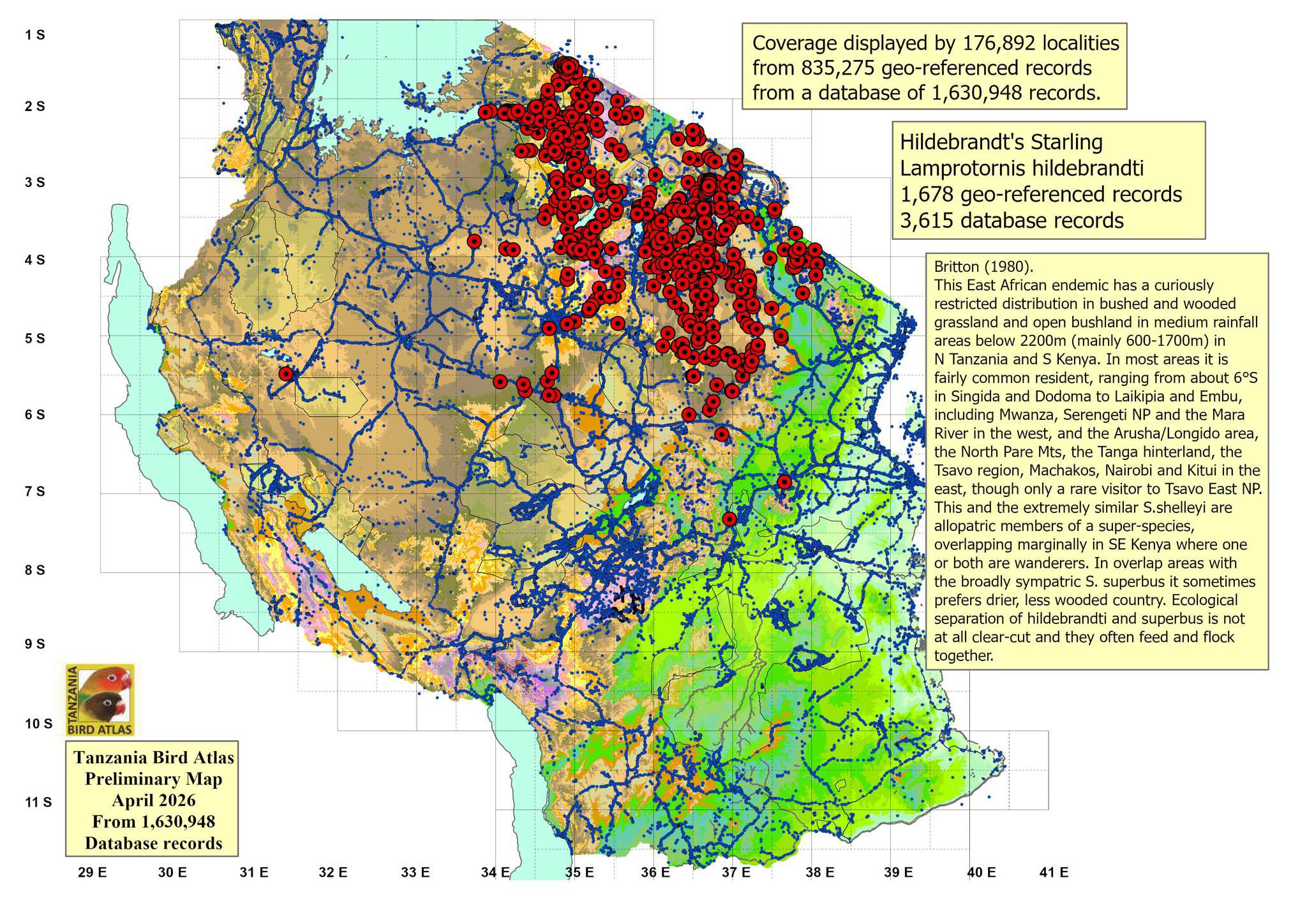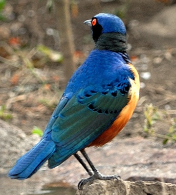 Hildebrandt's starling is an East African endemic that is found in north central and northeast Tanzania. The red eyes and lack of a white breast band distinguish it from the superb starling (see left 2nd row photo with both species (Engikaret). The 3rd row bird with bee is courtesy of Frank Priscus Shirima; the 5th row photo is courtesy of Kileo Kipanga. The right lower photo was taken in the Serengeti, courtesy of Steve Dolberg. The others were taken Tarangire, Oldonyo Sambu and the Serengeti. Click the photo above to see 15 enlargements including juveniles and immatures. |