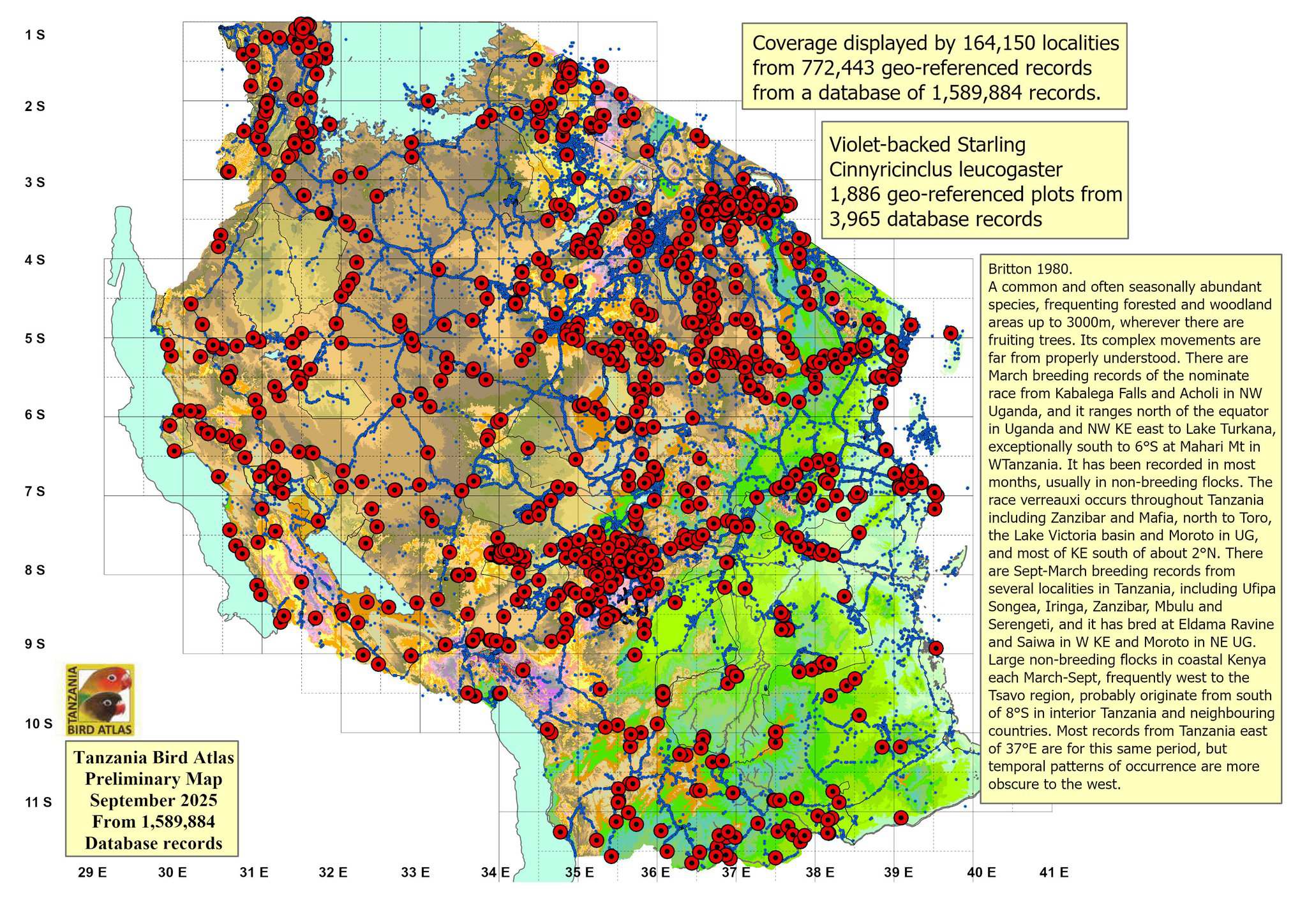 Depending on the light the violet-backed starling color may vary from black to light purple. These birds were photographed in Ushongo, Magara, Isunkaviola, Oldonyo Sambu, and Olasiti. The female has no iridescent plumage. Click the photo above to see 17 enlargements.