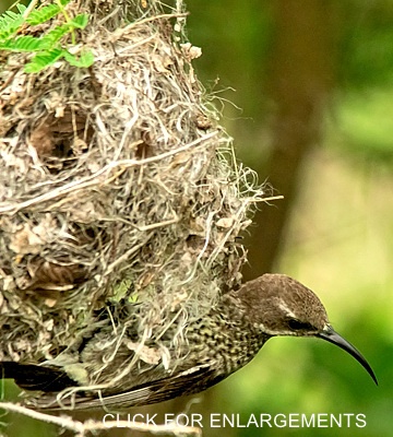 Hunter's sunbird is an East African endemic. The iridescent malar stripe and the iridescent shoulder patch can be difficult to see: both are seen in the upper three photos (Maasai Steppe & Mkomazi) which is courtesy of Frank Priscus Shirima. The right 2nd row female was in the Pugu Hills, courtesy of Isaac Kilusu. The left 5th row bird was seen in Same, courtesy of Sadik Kassam. The other photos were taken in Olasiti, Oldonyo Sambu, Shambarai and at KIA Lodge. The nest was photographed on the Maasai Steppe, courtesy of Frank Priscus Shirima: click it to see 14 enlargements including nests, juveniles and immatures. |