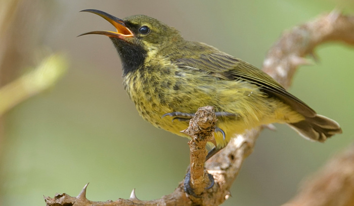These photos of the upper male and lower female amethyst sunbird were taken in Monduli, courtesy of Valéry Schollaert. The juvenile was in Zambia, courtesy of Per Holmen. The male in the bird bath was photographed in Olasiti. Note the iridescent blue cap and the amythyst throat patch. Click the photo above to see 23 enlargements.