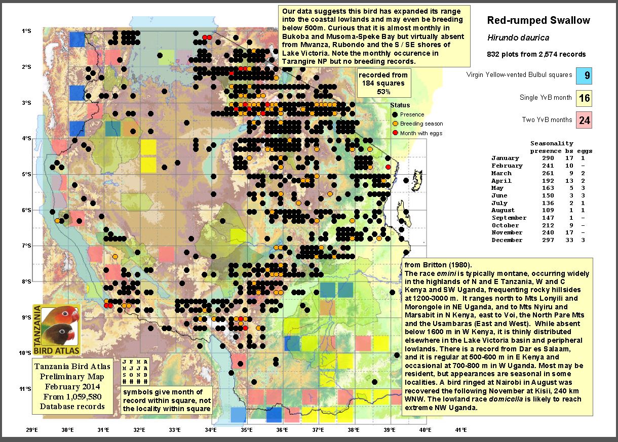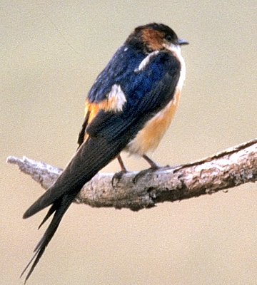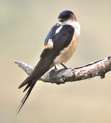 The African red-rumped swallow is the only red-rumped swallow with rufous ear coverts. The upper photo was taken in Ngorongoro Crater, courtesy Linda Bushman. The left 2nd row bird was seen in the Serengeti, courtesy of Rick Carlson; right 2nd row, Grumeti Reserve, courtesy Paul Oliver; both 3rd row photos, Tarangire; left 4th row, Mkuzi and the right 4th row, Soitorgoss. The bottom photo, location unrecorded, is courtesy of Doug McLennan; click it to see 10 enlargements.