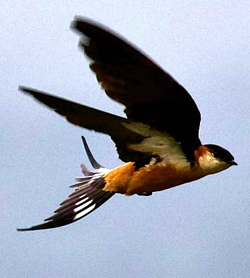 The mosque swallow is a large swallow (21 cm) with a rufous rump and a blue-black cap that descends to the eyes. Also note the rufous ear coverts and the white throat. These birds were photographed in Karatu, Lobo, Tarangire, Yaeda Valley and Mbeya. Click the right lower photo to see 7 enlargements. |