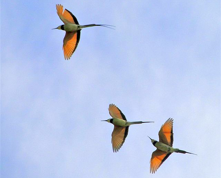 The white-throated beeeater is an intra-African migrant from sub-saharan Africa to northern and coastal Tanzania during it's non-breeding season from August to April and there is a non-migratory population in north central Tanzania at Ngare Naibor (row 5 left & bottom). The birds in flight were seen in Saadani NP, courtesy of Frank Willems. The 2nd row photos were taken in Selous (right), courtesy of Derek Kverno, and Olkarien Gorge, courtesy of Rick Carlson. The right 3rd row bird (Samburu NP-Kenya) is courtesy of Per Holmen. The others were seen at Pembe Abwe. Click the photo above to see 14 enlargements.