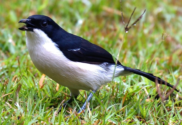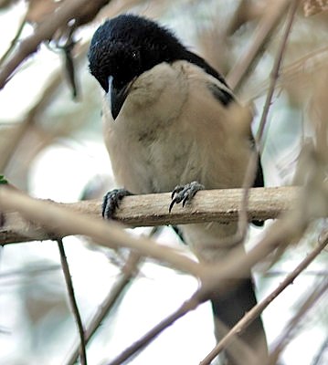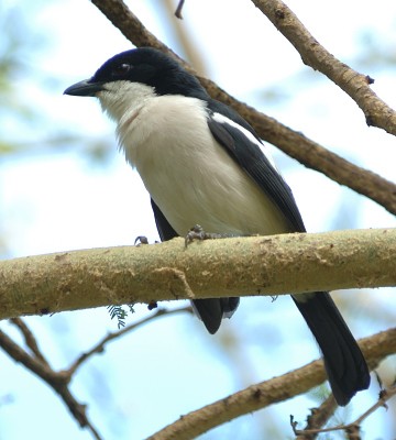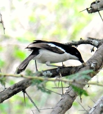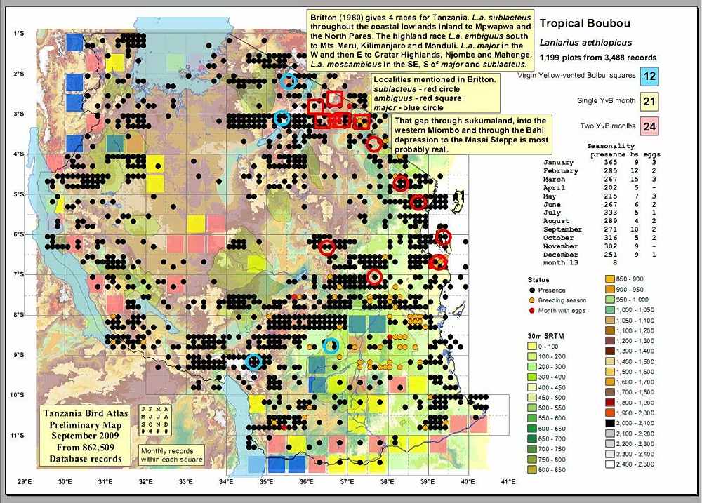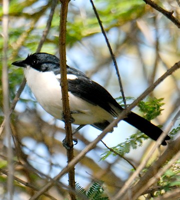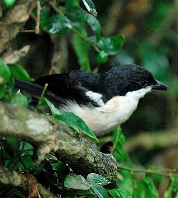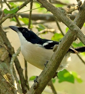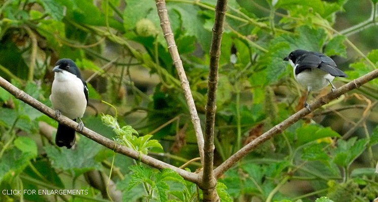 The Ethiopian, formerly called tropical, boubou, a commonly heard but less often seen bush-shrike, is black with a blue gloss and white with a pink tinge to the lower abdomen and vent. These birds were all photographed in Arusha NP (upper right) and Olasiti. Click the photo above to see 9 enlargements. |