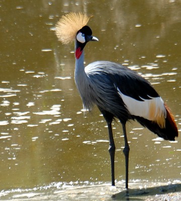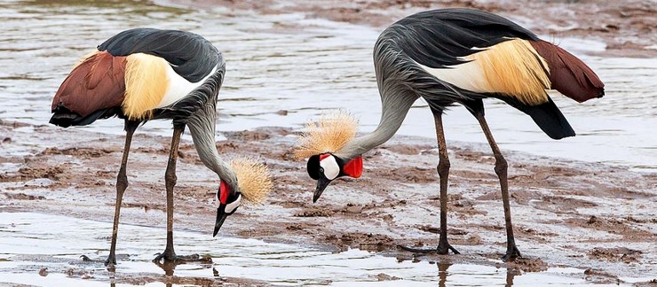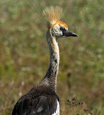 The grey-crowned crane is common and widespread in open grassland. The upper photo (Lake Mburo-Uganda) is courtesy of Karine van der Vurst. the 2nd row, location unrecorded, courtesy of Jim Zotkiewicz; the 6th row, Tarangire, courtesy of Michael Harris; the 7th row photo, Arusha NP, courtesy Paul Oliver; the 8th row, Mt. Meru Game Lodge, courtesy of Brad Johnson. The right 9th row row and the 10th row, Murchison Falls-Uganda, are courtesy of Karine van der Vurst. The 14th row adult (Ngorongoro) is courtesy of Kileo Kipanga. The other photos were taken in Tarangire, Serengeti, Simba Farm-West Kilimanjaro and Ngorongoro Crater. The slideshow includes photos of displaying and flying birds, juveniles and chicks. |
