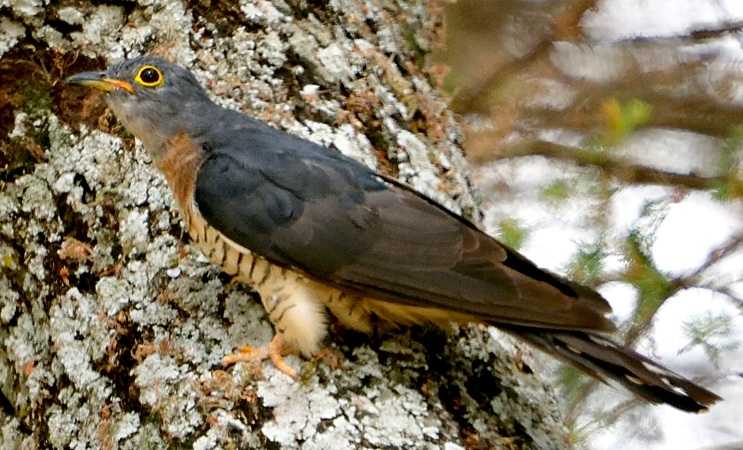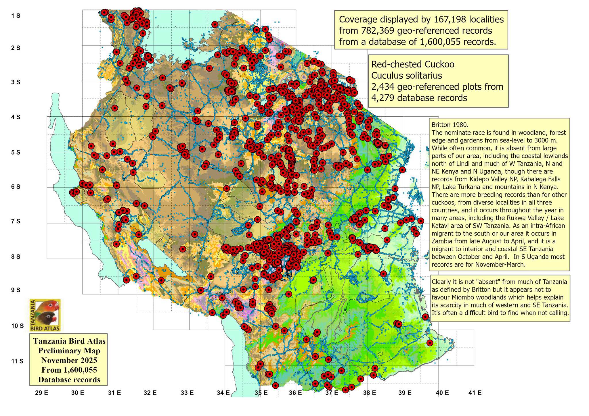 The red-chested cuckoo is common in forest, woodland and gardens. It is easily located by its 3-note call, click link to hear. The top, left 2nd row and right 3rd row photos (Kisongo) are courtesy of Frank Priscus Shirima. The right 2nd row photo (Tarangire) is courtesy of Isaac Kilusu. The other adults were photographed in Tarangire NP and Olasiti; the immature (left 5th row), also in Tarangire. The 4th row photo is courtesy of Paul Oliver and the right 5th row, Per Holmen. To see 19 enlargements which include juveniles being fed by their hosts, click on the left lower photo. |