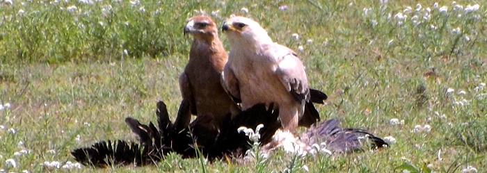 The tawny eagles in the upper photo were feasting on recently emerged termites (Mkomazi), courtesy of Kim Axmann. The 2nd row adult (Ngorongoro) is courtesy of Amos Pampy Hardecker. The 'spotted' morph in the right 8th row is rare, estimated at only 1 in 250,000 tawny eagles; it was seen at Ndutu, courtesy of Paul Oliver (another is in the slideshow #43); The 6th row pair, seen at Mkomazi NP, is courtesy of Bob Kasworm; the right 10th row photo is also courtesy of Paul Oliver. The photo of the light and dark morphs was taken at Naabi Hill, courtesy of Tom Nicholls. The upper flight photo (Serengeti) is courtesy of Rick Carlson. Other photos were taken at Manyara Ranch, Olasiti, Ndutu and Yaida Valley. Click the image above to see a slideshow that includes other morphs, immatures, fledges, nests and various activities. Click on the links below to see other activities: 1. View a tawny that brought down a flying white stork. 2. View a juvenile feeding. 3. View a fledge flying from a nest. |