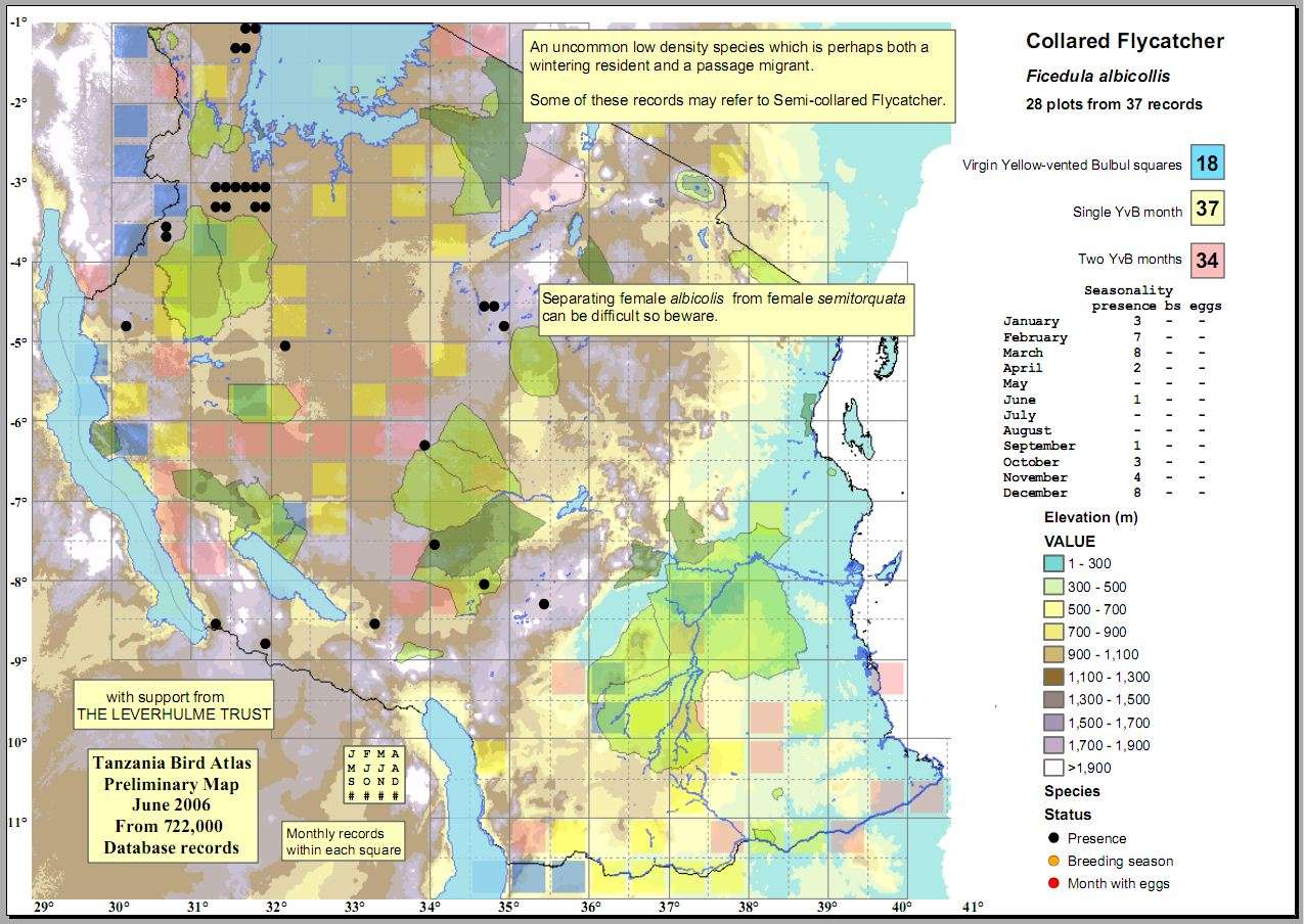 The collared flycatcher is uncommon in central and southwestern Tanzania. Note the white forehead spot, the complete collar and the black tail. This photo of a female was taken in Zambia, courtesy of Per Holmen. |