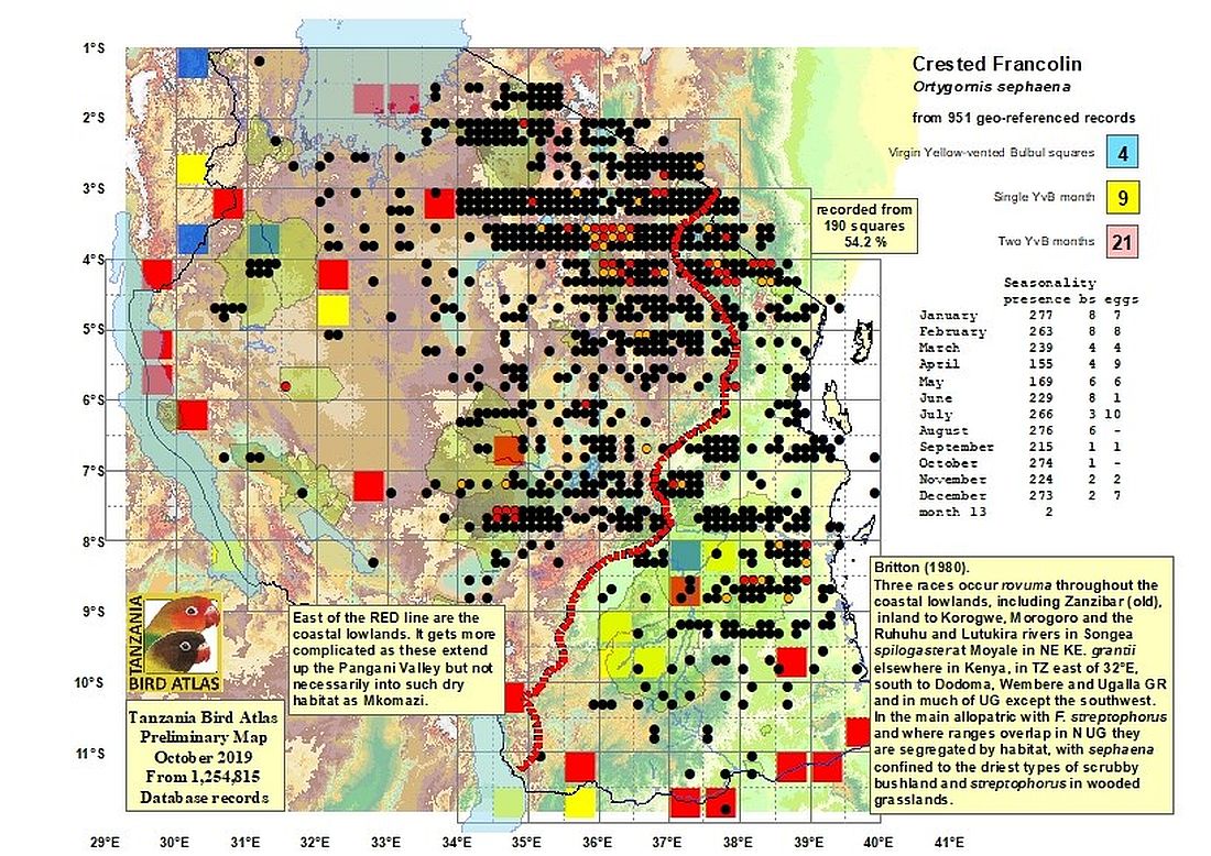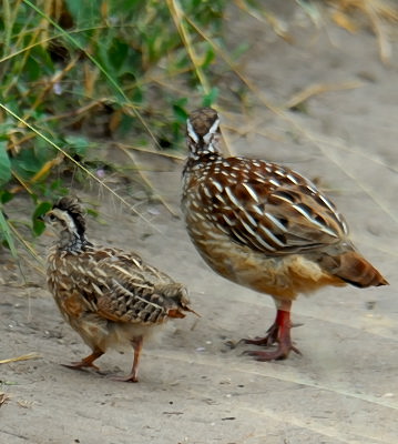 The upper photo (Mkomazi NP) is courtesy of Frank Priscus Shirima. The right 2nd row photo shows a pair of crested francolins with the smaller female on the left. The female has less bold breast markings with dark vermiculations on a buffy breast while the male shows brown with white shafts. All other photos were taken in Tarangire NP. Click the photo above to see 15 enlargements including chicks and immatures.