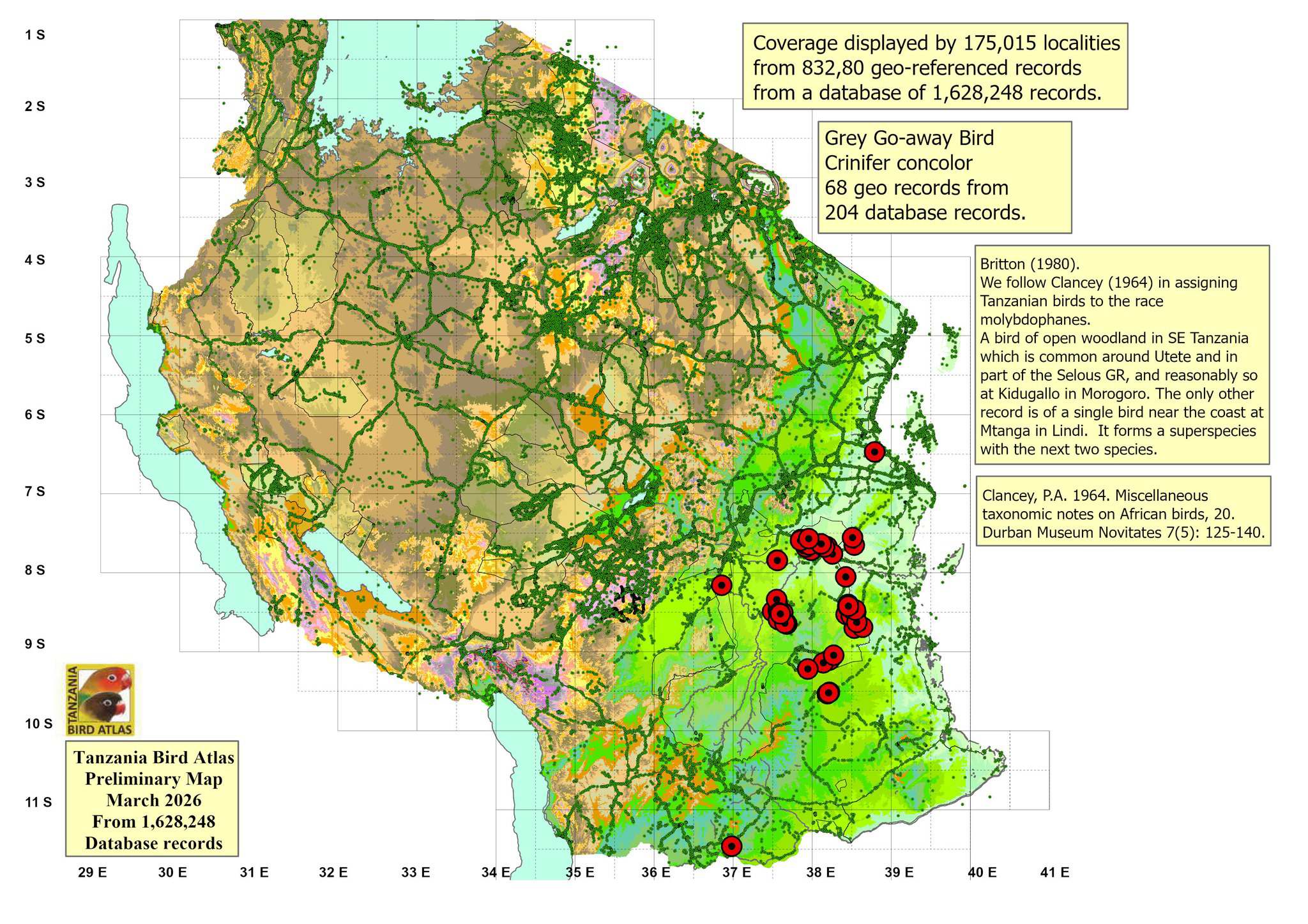 The grey go-away-bird is seen in southern Tanzania. The upper bird was photographed in Etosha NP-Namibia, courtesy of Mike Graham. The left 3rd row bird in flight was seen in Hwange NP-Zimbabwe. The other photos were taken in the Okavango delta-Botswana. |