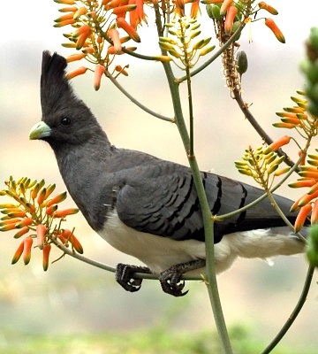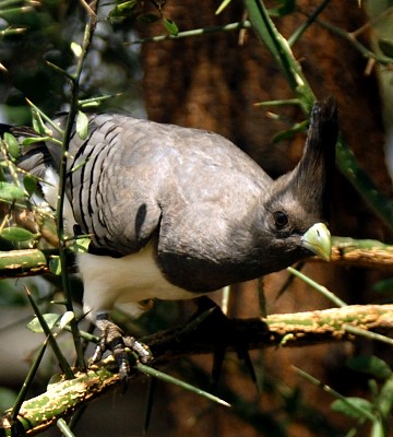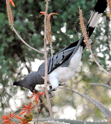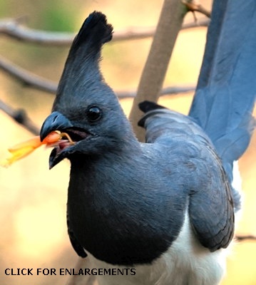 Pairs or groups of white-bellied go-away-birds are a common sight in the dry acacia country of north central and central Tanzania. Sexes are alike except the male has a black bill while the female bill is light green. The upper pair was photographed at Shambarai swamp (9-18); the 3rd row male was seen in Kenya (1-07), courtesy of Stuart Webb; and the flight photo (Mkomazi, 6-18) is courtesy of Florence Holmen. All of the other photos were taken in Tarangire NP. Click the photo above to see 20 enlargements.
