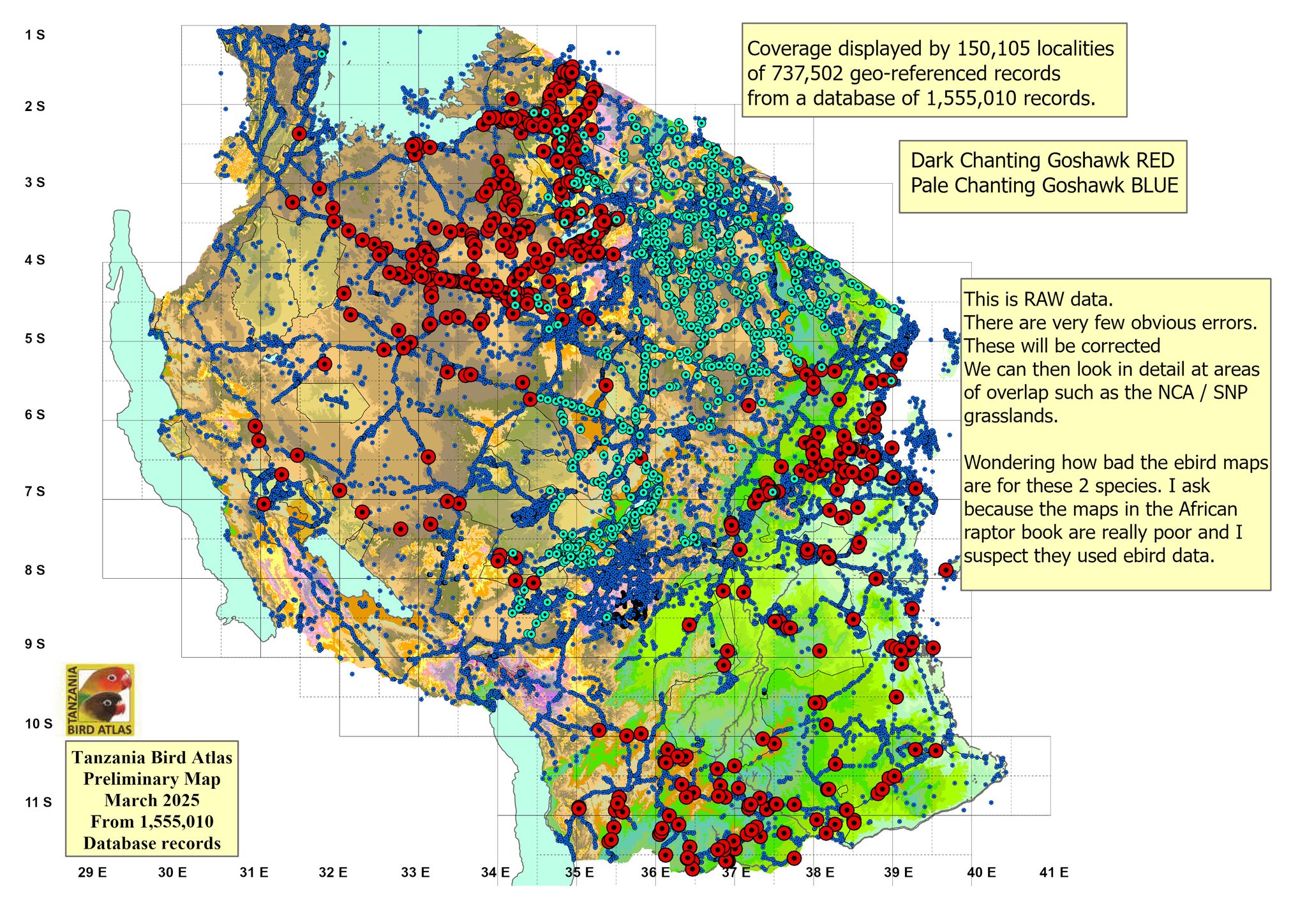The top photo (Mkomazi) is couresy of Kim Axmann. The juvenile eastern chanting goshawk (right 7th row) was seen at Manyara Ranch, courtesy of Colin Beale. The 5th, 8th, 9th and 10th row photos (Nadosoito & Oldonyo Sambu) are courtesy of Franl Priscus Shirima. The right lower adult was also seen in Mkomazi NP. The rest of the photographs were taken in Sukuru and Tarangire. Click the photo above to see 21 enlargements including juveniles and immatures. |