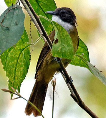 The red-tailed greenbul may be seen in undergrowh and mid-story in the forests of northwestern Tanzania which is the eastern-most part of its range. Note the white throat, blue-grey skin around the eye and the reddish tail. The left upper photo was taken in Kakum NP-Ghana, courtesy of Francesco Veronesi; the right upper, Semliki NP-Uganda, courtesy of Karine Van der Vurst; left lower, western Uganda, courtesy of Isaac Kilusu; and the right lower, Minziro FR. |