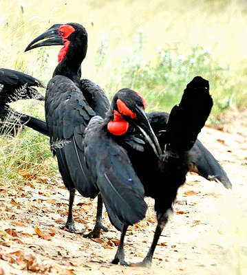The lower four photos show a southern ground-hornbill feeding insects to chicks in a nest in the hollow top of a broken palm tree trunk. The enlargements include feeding of young in a cavity nest. Most of the other photos show birds in bushed or wooded grassland which is their preferred habitat. The adult male has red facial skin and a small "notch" on the top of the bill near the base; the female has a blue throat patch, sometimes easily seen (see slideshow photos #32 & 33), sometimes speckled or inconspicuous; immatures have yellow facial skin. The chick (Marangu) is courtesy of Amos Pampy Hardecker. Note slideshow photos 2-7 which show a "dancing" or bonding behaviour. These photos were taken in Tarangire NP, Lake Manyara NP, Okavango delta and the Serengeti. Click the photo above to see the enlargements. |