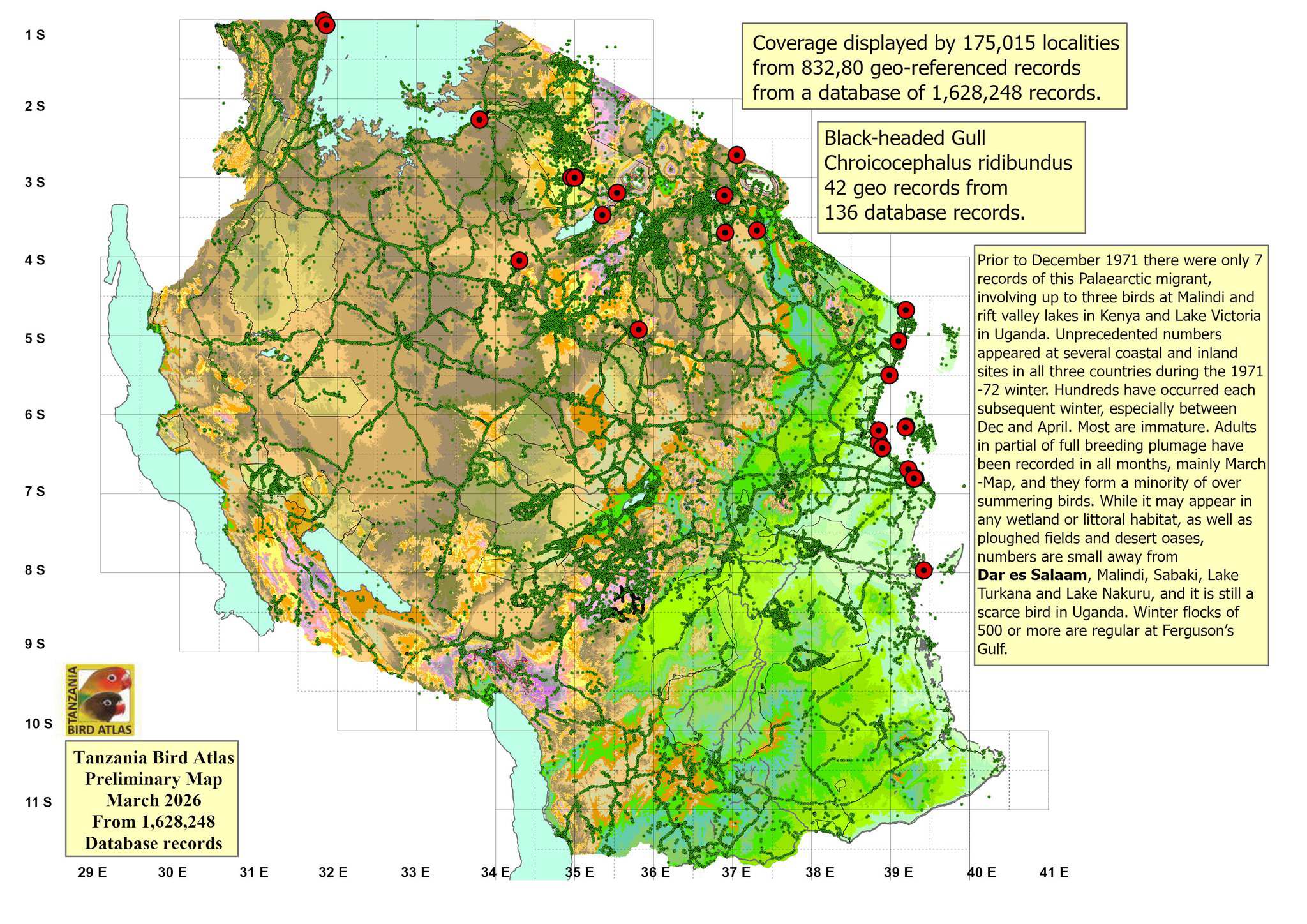 The black-headed gull is an uncommon visitor to our area, see map. The upper photo was taken at Msasani Bay, courtesy of Riaan Marais. The left 2nd row photo is of an adult in moult with part of the hood remaining. The right 2nd and 3rd row photos are of October (winter) plumage. The left 4th row photo is a 1 Cy bird in August. The left 3rd row and right 4th row photos are 1Cy birds in October, all courtesy of Dr. Louis A. Hansen.