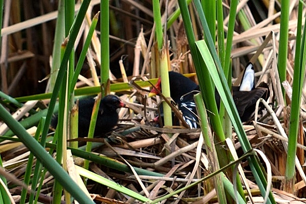 The common moorhen is common on permanent waters throughout the country. The nest was photographed at TPC near Moshi, courtesy of Christine Baissac. The 2nd row immature (Lake Manyara) is courtesy of Karine Van der Vurst. The left 3rd row immature was in Tarangire. The lower two photos were taken in the Serengeti, courtesy of Fain Zimmerman (right) and Steve Dolberg. The other photos were all taken in Ngorongoro Crater. Click the photo above to see 13 enlargements. |