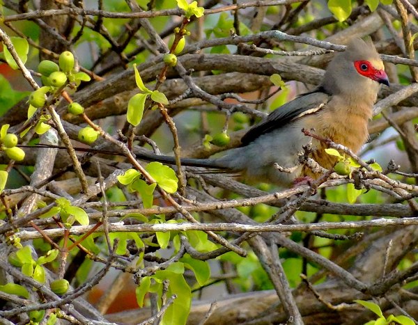 The red-faced mousebird is found in southern Tanzania. It is similar to the blue-naped mousebird except it has a light brown forehead and lacks the blue nape. The upper birds were photographed in Kasanga, courtesy of Silas Olofson. The middle photos were taken on Ibo Island (Mozambique), courtesy of Valéry Schollaert. The botom photo was taken at Mtwara, courtesy of Kileo Kipanga. |