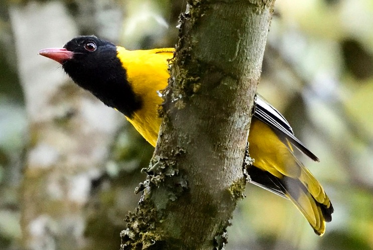 The black-tailed oriole, also called montane oriole or mountain oriole, is an east African endemic, uncommon in Tanzania in the higher elevations of the northwest. Similar to the black-headed oriole, the upper side of the central tail feathers is black instead of olive green. The upper two and left 3rd row birds were seen in the Castle Forest-Kenya, courtesy of Per Holmen; the right 3rd row, in the Nyungwe Forest-Rwanda, courtesy of Jason Anderson. |
