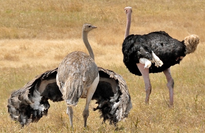 The major ostrich hen and several minor hens lay their eggs in a single nest which the major incubates. The chicks hatch in about six weeks and are out of the nest in three to four days. The 2nd row egg ws in the Serengeti, courtesy of Ethan Kinsey. The 3rd and 4th row photos were taken in Silale swamp; the 5th row females, also in Tarangire. The drinking females were near the Tarangire Safari Lodge; click it to see a video of the same scene with giraffe. The bottom photo (Ngorongoro Crater), is courtesy of Fain Zimmerman; click it to see a slideshow that includes photos of a major hen incubating, eggs, chicks and a nursery, as well as juveniles and adults. The 7th and 8th row photos are of of a mating pair (Ngrorogoro); click them to see a series which shows the pair running, the male about 30 meters behind the female. The female stopped and the male dropped to the ground and rolled his head, neck and body back and forth (images 1-8) while the female stood with wings extended, slowly flagging (images 9 & 10). The male rose, ran about 10 meters toward the female, dropped to the ground and repeated the display three times. The female then dropped to the ground, the male mounted her and again repeated the back and forth head and neck motions during copulation (images 13 – 23). The other photos were taken in Tarangire. |