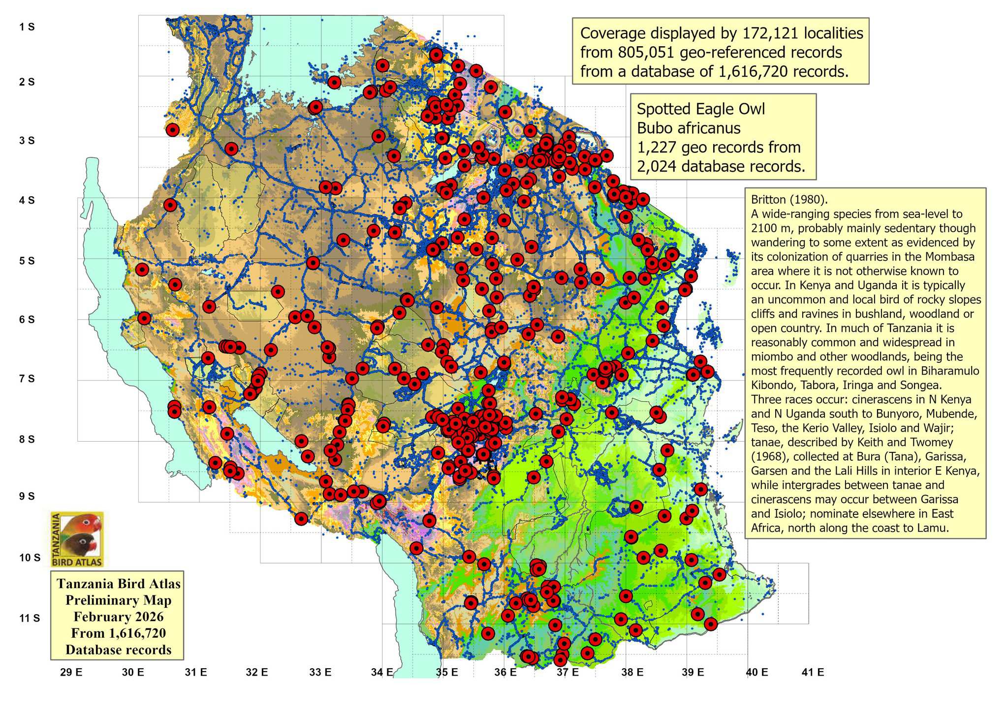 A pair of spotted eagle-owls and their single offspring was photographed in Erwin Kinsey's garden and under his satellite dish (Ngaramtoni, also see the enlargements). The pair (left 3rd row) has returned to this location annually to nest for many years. The right upper photo was taken at Lake Chala, courtesy of Lyn Waltenberg; the right lower photo, in Olasiti, courtesy of Christopher Moses. The rocky nest and egg photos (Oldonyo Sambu) are courtesy of Frank Priscus Shirima. The chicks (left 3rd row), were seen near Moshi, courtesy of Michael Harris. The other photos were taken in Ngaramtoni, Olasiti and Lemuta. Click the left lower photo to see enlargements including chicks, fledges, juveniles and adults. |