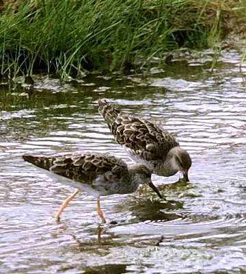 The ruff is a common palearctic migrant, seen on fresh and alkaline lakes throughout Tanzania. Note the distally decurved bill and the marked scaling. The left lower photo (Lake Nakuru, 1-17) is courtesy of Karine Van der Vurst. The ruff in moult was photographed at TPC south of Moshi (7-19), courtesy of Christine Baissac. The large flock was also at TPC (1-22), courtesy of Bob Kasworm. The other photos were taken in Mikumi, Serengeti, Tarangire and Ngorongoro Crater. Click the photo above to see more. |